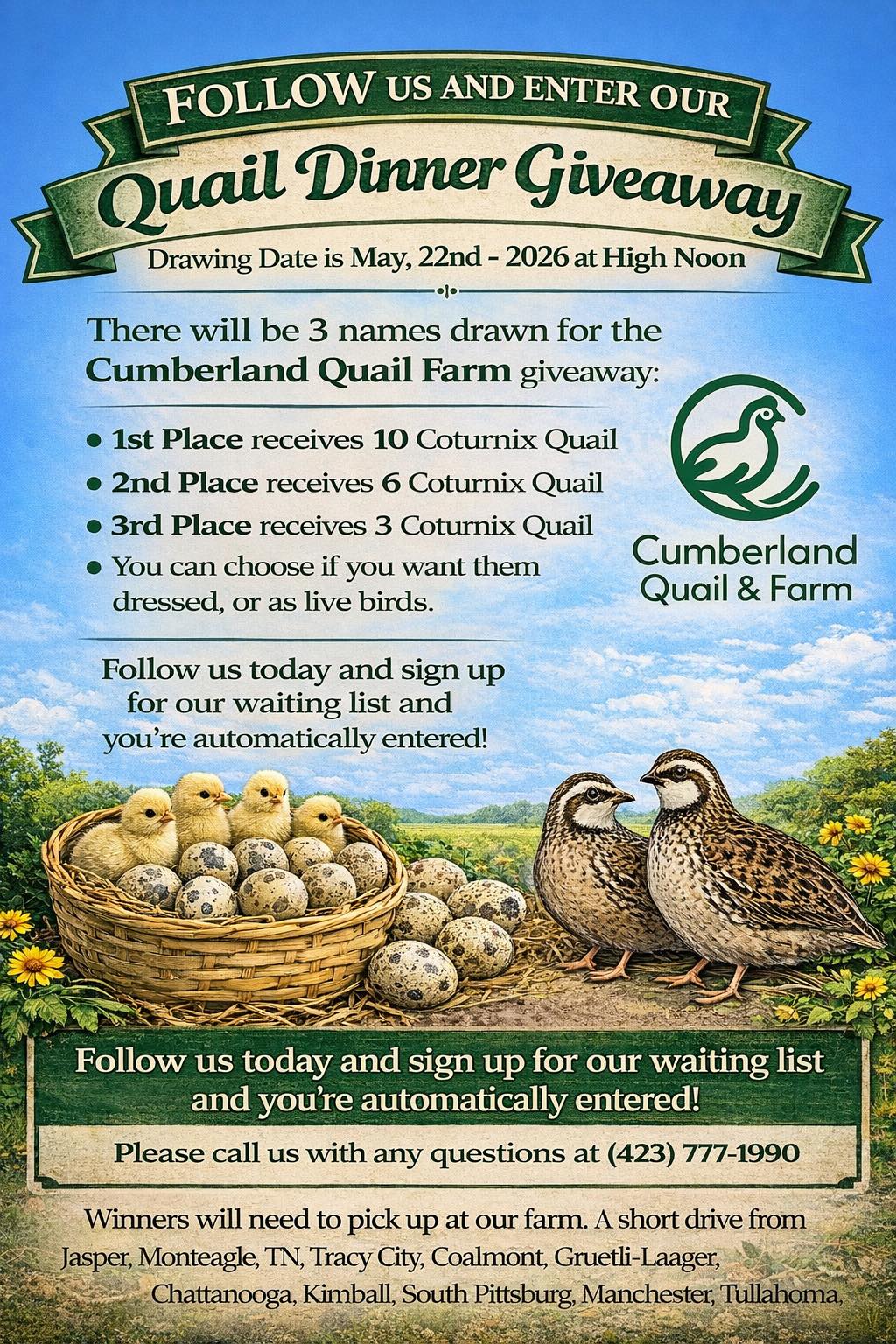 We raise Coturnix quail in small batches here on the South Cumberland Plateau near Jasper, Tennessee, focusing on healthy birds, clean environments, and responsible breeding practices.